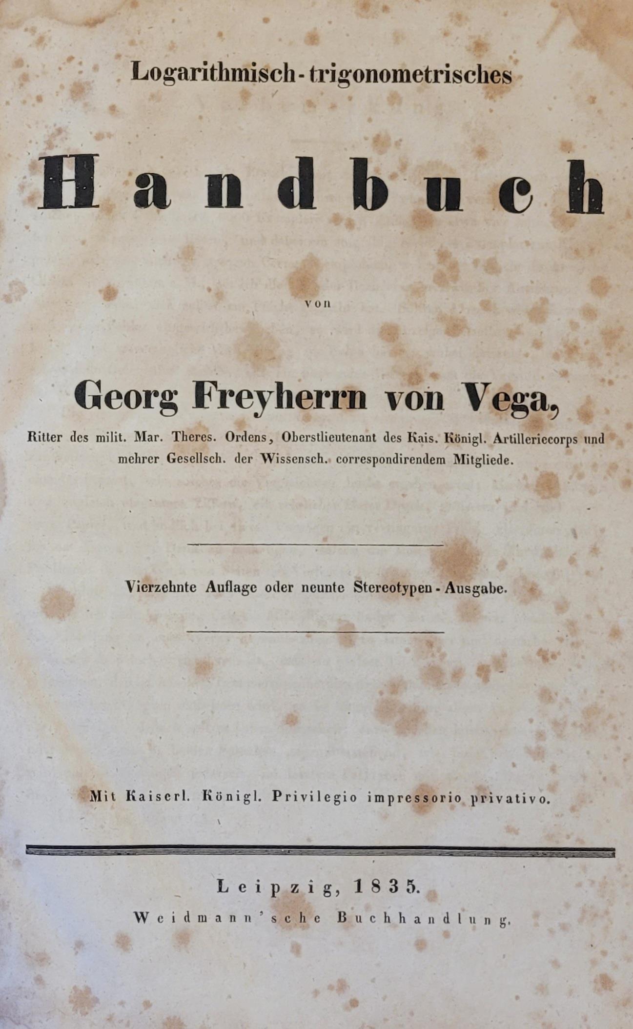 Georg Freyherrn von Vega, Logarithmisch-trigonometrisches Handbuch. 279 strani, trde platnice. Leipzig 1835, knjižni blok s starostnimi pegami, platnici nekoliko obribani, sicer lepo ohranjen izvod