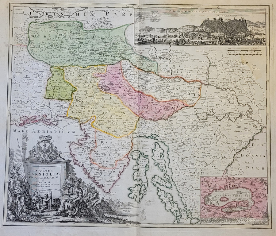 Napis v kartuši: DUCATUS CARNIOLIAE VINDORUM MARCHIAE et HISTRIAE ex ampliore QUONDAM L. B. VALVASORII … exibita a. Joh. Bapti. Homanno Noribergae. Nürnberg, po letu 1716