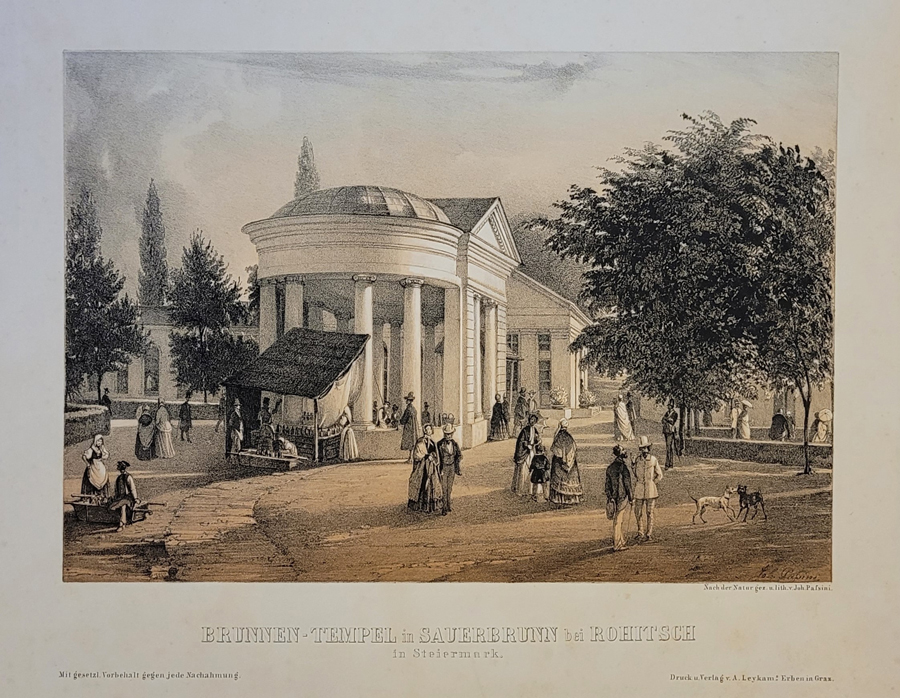 Napis: Brunnen-Tempel in Sauerbrunn bei Rohitsch in Steiermark – Tempelj s studencem v Rogaški Slatini pri Rogatcu na Štajerskem.
