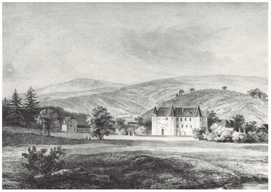 Napis: Burg Schleinitz im Marburger Kreise – Dvorec Slivnica v mariborskem okrožju. Okoli 1845