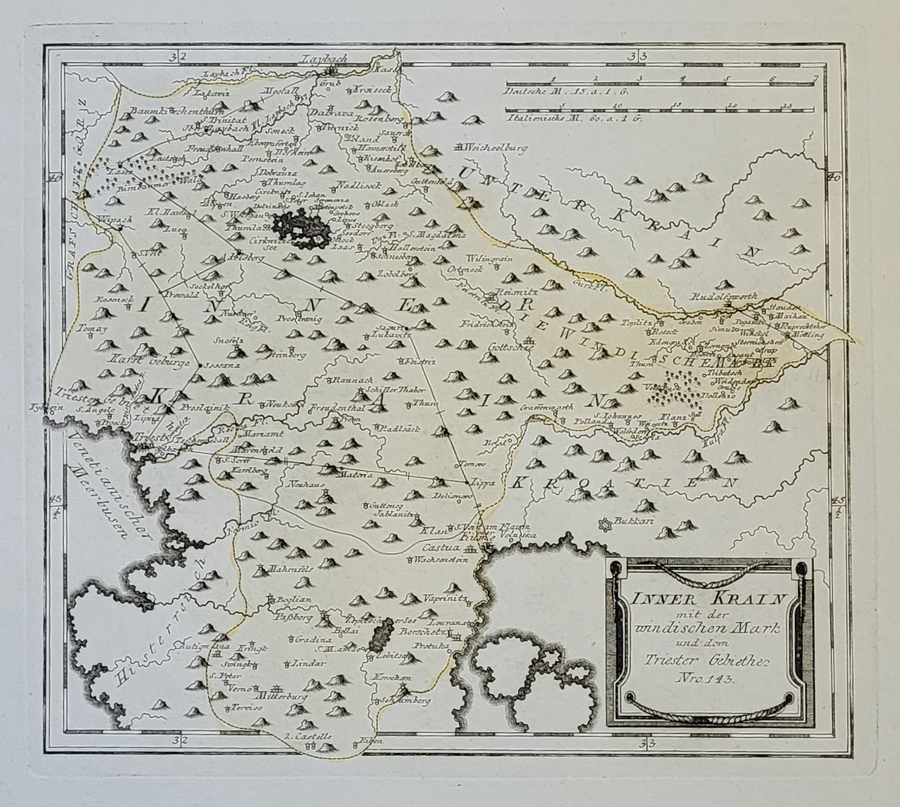Napis v kartuši: INNER KRAIN mit der windischen Mark und dem Triester Gebiethe, Nro. 143. Izšlo v: Schauplatz der fünf Theile der Welt mit bestaendiger Rücksicht auf die besten Originalwerke in drey Theile zusammengetragen von einer Gesellschaft Geographen. Erster Theil. Wien 1789, graver Igraz Albrecht.