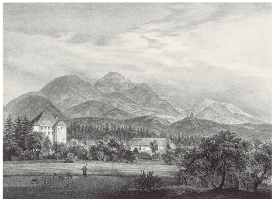 Napis: Ursolla Berg mit der Petzen und der Herrschaft Lechen bei Windisch Gratz – Uršlja gora s Peco in gospostvo Legen pri Slovenj Gradcu. Okoli 1845