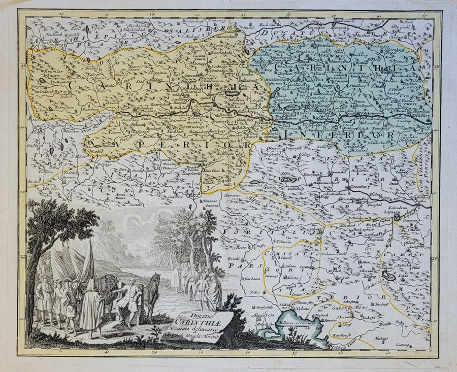 Napis v kartuši: Ducatus Carinthiae, accurata delineatio a Christoph Weigelito Norimb. Iz: Johann David Köhler, Atlas Manualis. Nürnberg, okoli 1720.
