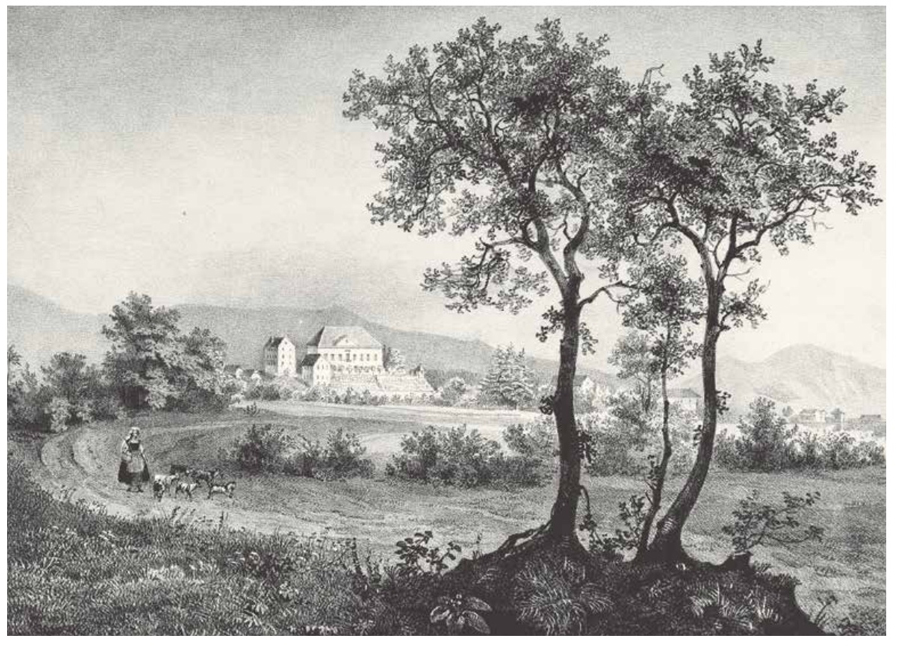 Napis: Schloss Sallach im Cillier Kreis – Dvorec Zalog v celjskem okrožju. Okoli 1845