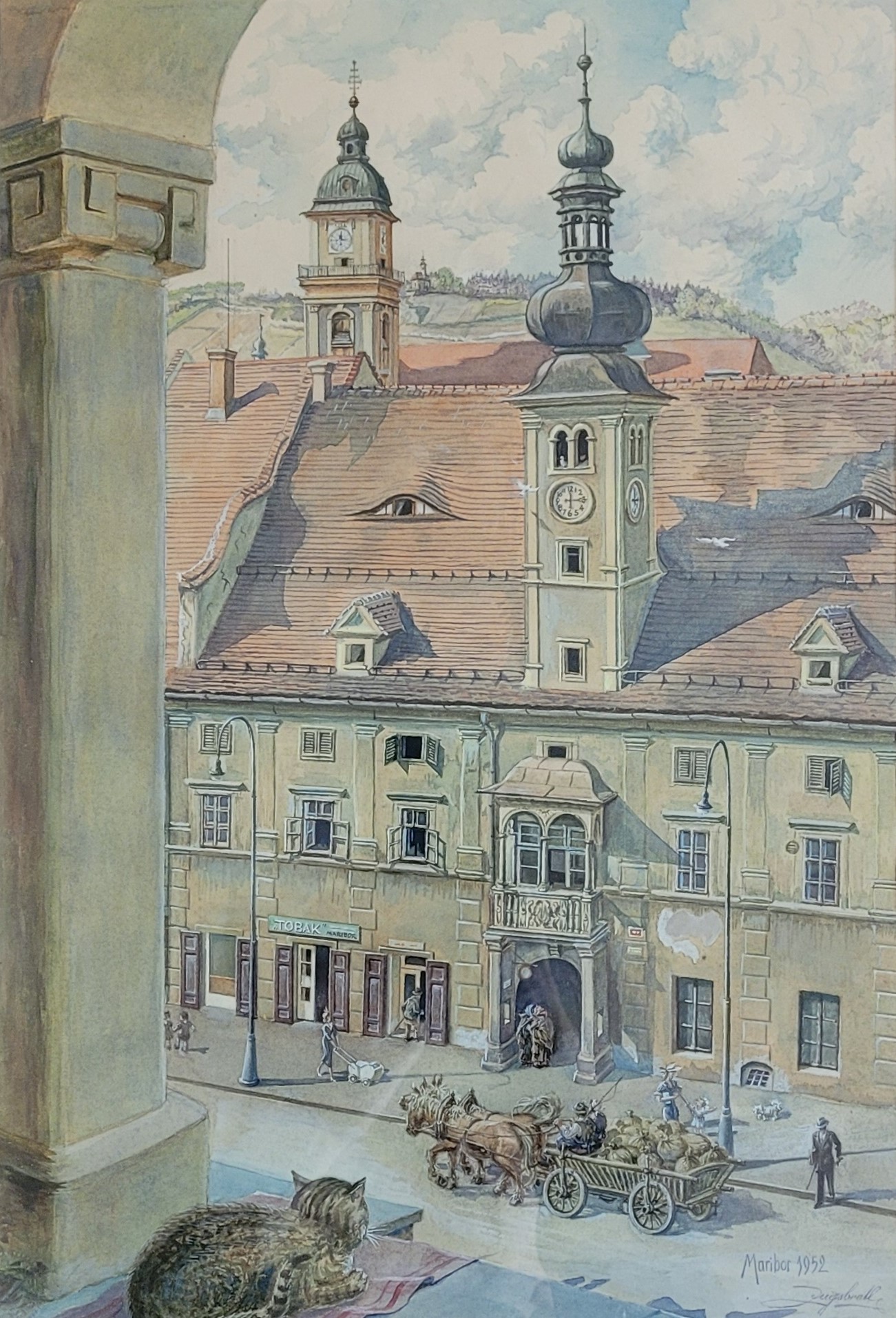 Neznani avtor Maribor, Pogled iz Velike kavarne na Rotovž 1952, -- akvarel in gvaš -- 41 x 28 cm Povpraševanje