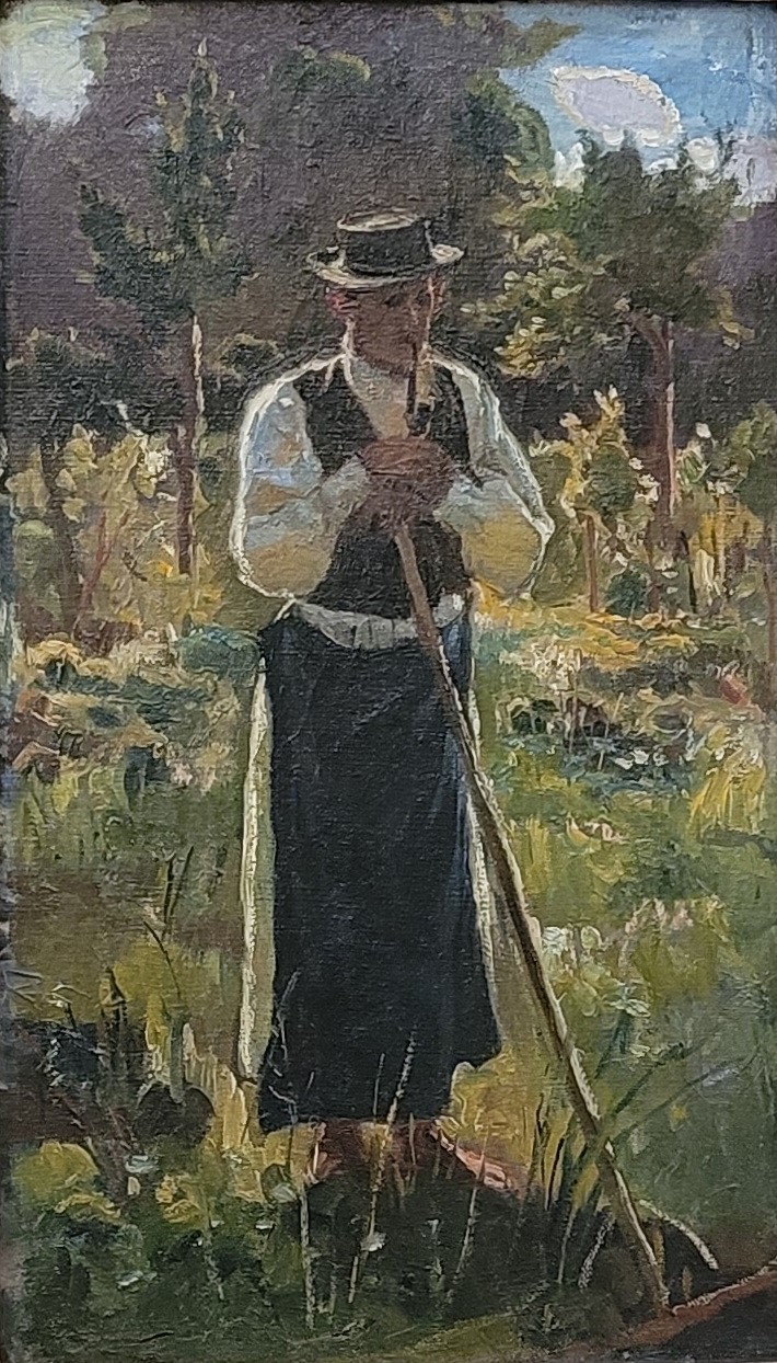 Neznani avtor Vrtnar z grabljami in pipo Okoli 1880, -- olje na platno -- 42 x 25,5 cm -- bogat okvir Povpraševanje